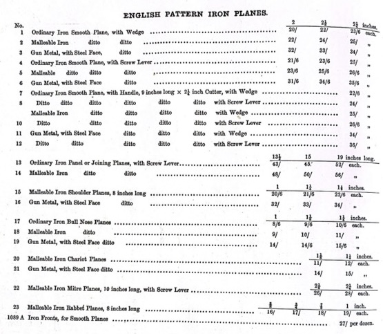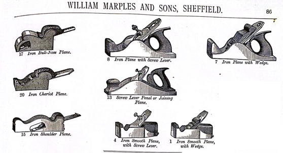 The first reference that I can find to show that MARPLES sold Infill Planes is in the 1888 Catalogue and these planes were almost certainly all made for MARPLES by the firm of Henry Slater in Clerkenwell, London. Slater made these style planes for very many other ‘makers’ and he would most often leave his ‘mark’ hidden somewhere on the plane if it was not badged as being made by SLATER. The 1888 and 1891 Catalogues show identical listings under the heading…”English Pattern Iron Planes‘ and the planes were numbered 1 through 23.