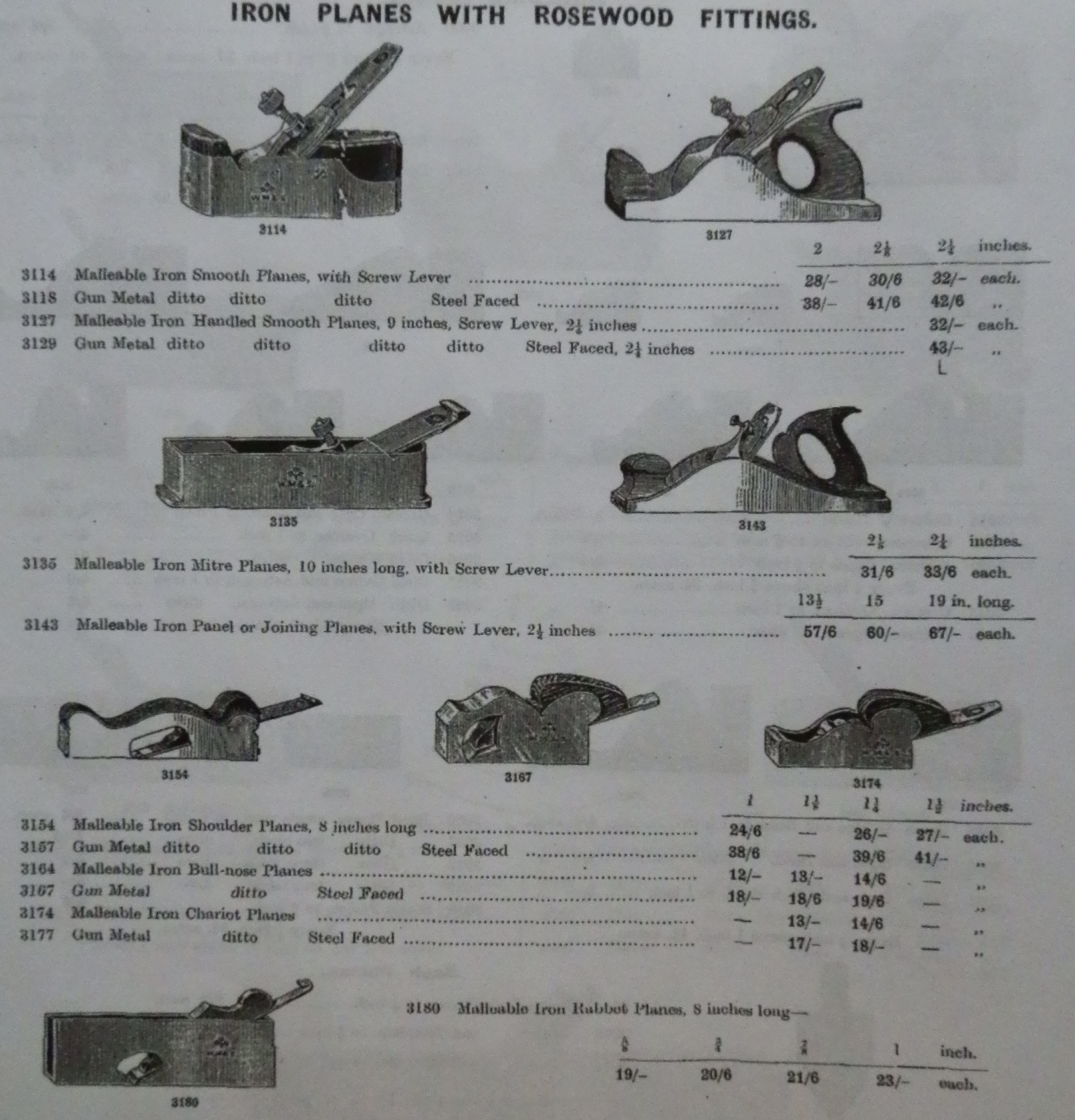 The 1897 Catalogue shows the same number of planes listed but now under the heading of ‘Iron Planes with Rosewood Fittings‘.