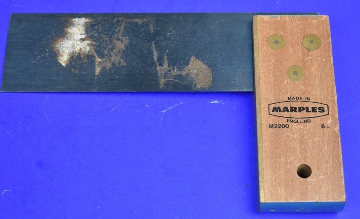 The photo [below] shows an original ‘Shockproof’ Square, but not labelled as such. NOTE: the thick 1/4″ dovetailed brass plate. [The brass face plate was originally ‘dovetailed’ into the wooden stock and this may have been the situation until the ‘Shockproof’ wording was removed upwards to join the other wording [hard to explain!!!] See below.
