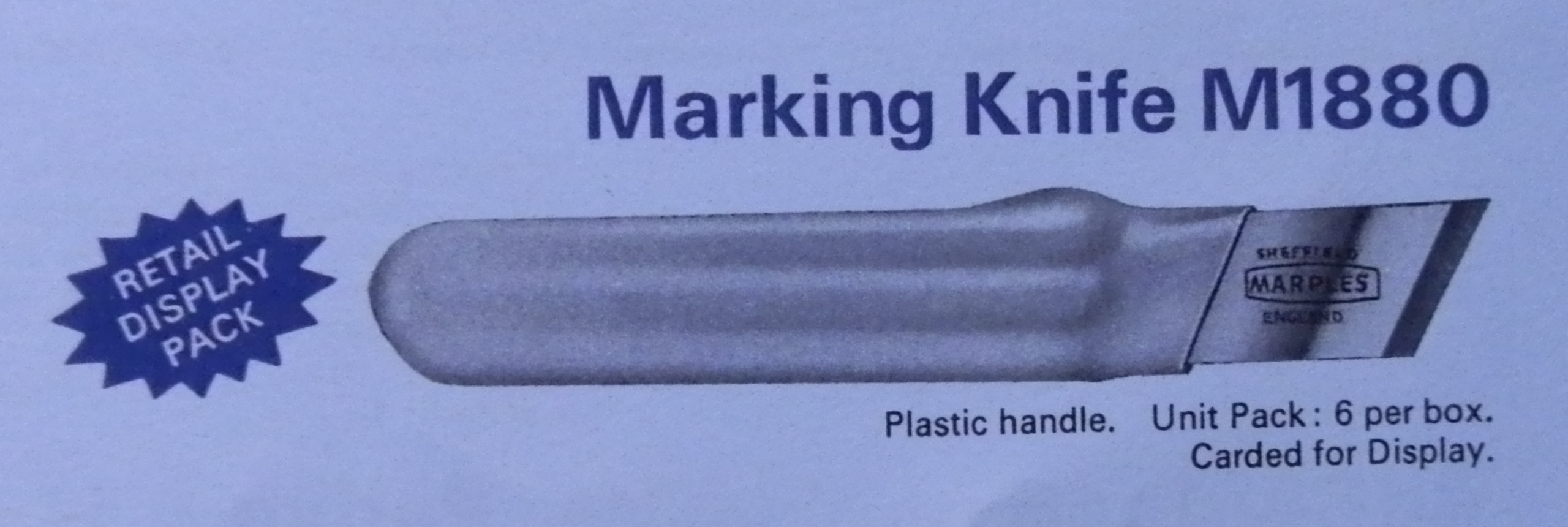 It was not until the 1965 Cat. that the name ‘Marking Knife’ was applied by MARPLES, although I remember that they were called that back in 1957. Up until the 1938 Cat. the wooden scales were of Rosewood but ‘Hardwood’ is the description given thereafter. The item #1879 is still described as having Hardwood handles in the 1972 Cat. but by 1983 [Record Ridgeway Group] the tool came with an Orange rubber coating over the handle.