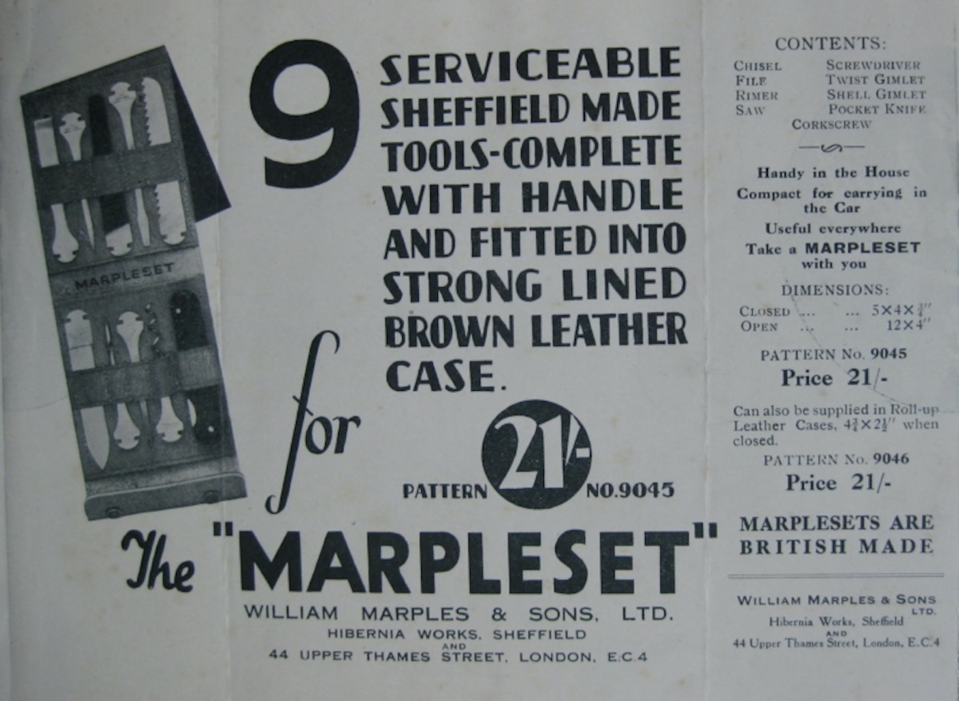 This set of household tools is first seen as a page insert to p.217 in the 1928 Catalogue. It does not show in 1938 probably due to the poor design of the holding spring mechanisms which lead to broken spring catches. They were designed to hold 9 different tools for light use and these tools could be held in the ‘handle’ both in a knife aspect or a corkscrew aspect. [see pictures below]